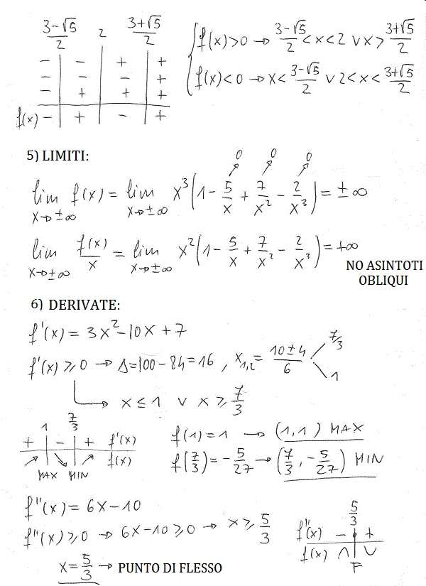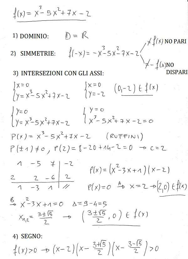 nell’intersezione con gli assi ho usato il metodo di ruffini per scomporre il polinomio ( e di conseguenza trovare le soluzioni di f(x)=0). Nello studio del segno ho risolto f(x)>0 appofittando della scomposizione fatta al punto precedente.