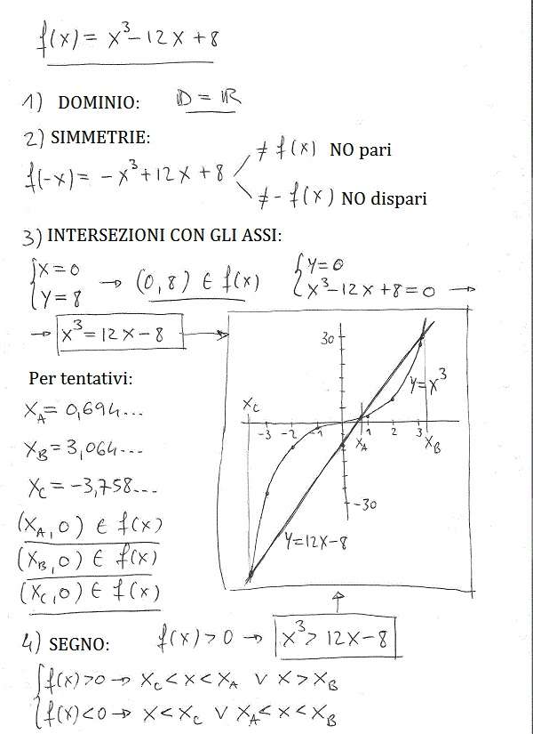 1. x^3 è una cubica, 12x-8 una retta. Sono due funzioni elementari quindi non è difficile disegnarle. Sostituisci alla x, nelle due funzioni, valori vicini a quelli risultanti dalle intersezioni sul grafico, vedendo quando l’altezza delle due funzioni viene uguale.