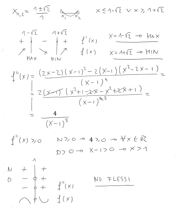 Ciao Albert.. nel 6° punto quando calcoli il delta di f'(x) come fa a tornarti 2? a me torna 8 e anche quando calcoli le x a me viene (2+-sqrt(8))/2.. dove sbaglio?