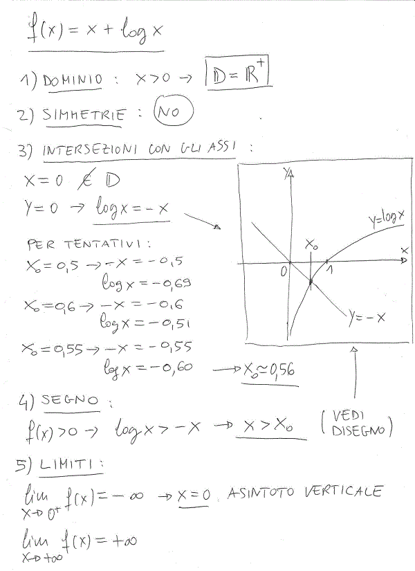 Disegniamo le due funzioni sullo stesso piano cartesiano, e vediamo quando sono uguali (per quali x hanno la stessa y). Notiamo che il punto di intersezione sta tra x=0 e x=1, quindi andiamo per tentativi: per x=0,5 la retta sta sopra logx (infatti -0,5>-0,69), per x=0,6 la retta sta sotto (infatti -0,6<-0,51). Il punto cercato sarà quindi tra X=0,5 e x=0,6. A questo punto puoi provare con 0,55 e noti che la retta sta sopra, quindi il punto sarà tra 0,55 e 0,60…io mi sono accontentato di due cifre dopo la virgola e con questo procedimento ho ottenuto x=0,56.