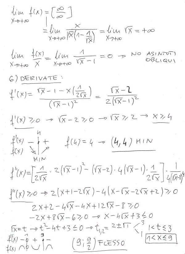5. Salve non capisco la derivata prima! riconosco la formula che hai applicato ma non riesco a capire perchè non consideri il fatto che sia una irrazionale fratta? ovvero dovresti moltiplicare tutto quello che hai appena trovato prima del risultato finale per la derivata della radice ovvere uno fratto 2 che moltiplica la radice di x meno uno . poi non riesco a capire come ti viene quel risultato malgrado provando e riprovando, ad esempio dove prendi il numero “2” che si trova al denominatore del risultato finale della derivata prima?