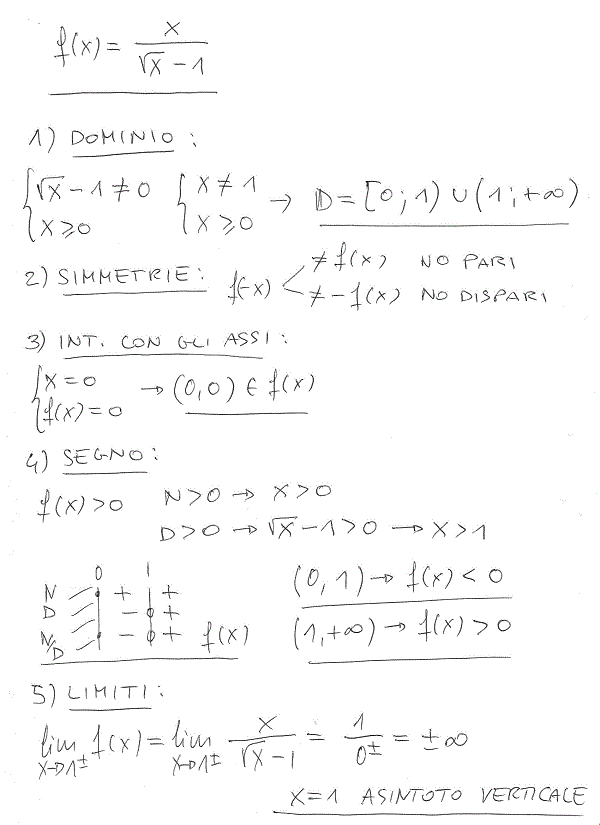 3. Salve potrebbe chiarirmi una cosa? In pratica a noi la prof per fare il grafico ci ha insegnato di trovare gli asintoti dunque non riesco capire il motivo per cui lei ha trovato la f’ e la f ”, ed il massimo e il minimo.. comunque tracciando il grafico come sono abituata a fare non riesco a capire perchè il suo per la x che tende a 1(meno) che torna (meno) infinito le parte dallo zero..potrebbe spiegarmi il perchè di questi miei dubbi..la ringrazio!
