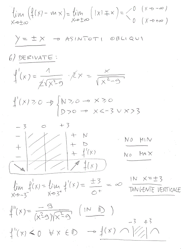 Ciao Albert, la derivata seconda a me viene dopo il minimo comune multiplo, [2*(x^2-9)^2-2x^2*(x^2-9)]/[2*rad(x^2-9)*(x^2-9), dopo metto in evidenza (x^2-9) e il risultato finale mi da -9/(rad(x^2-9)), dove sbaglio??