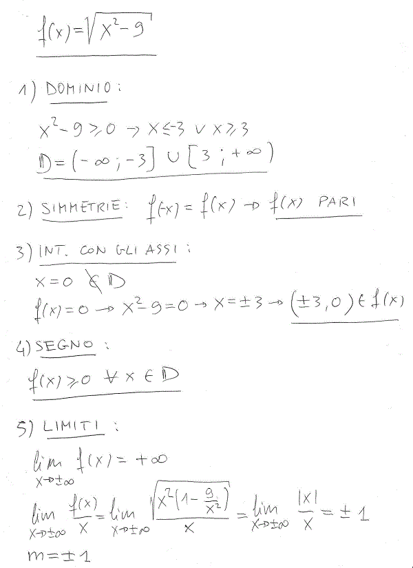 Ciao Albert. Non riesco a capire come fai a dire che in 3 e -3 ci sono due flessi a tangente verticale. La loro presenza non dovrebbe essere confermata dal valore del limite pari a + o – infinito per x che tende a + e – 3 da destra e da sinistra? in fatto che in -3+ e 3- la funzione sia fuori dominio cosa ci può far concludere? scusa ma non riesco a capire. grazie mille