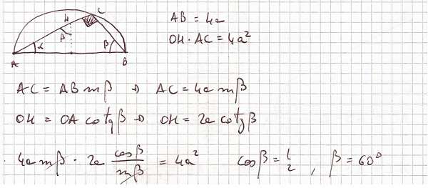 Inscrivi un triangolo ABC in una semicirconferenza di centro O e diametro AB = 4a, in modo che l’angolo in B risulti maggiore dell’angolo in A. Indica con OH il segmento perpendicolare al diametro (con H su AC). Determina l’angolo in B in modo che il rettangolo di base OH e altezza AC abbia area 4a^2.