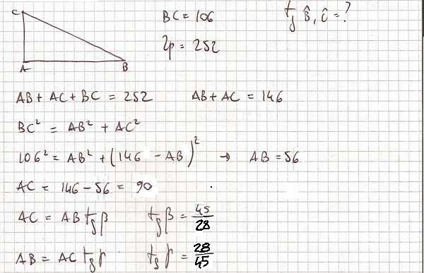 Trigonometria – Esercizio 17 L’ipotenusa di un triangolo rettangolo è lunga 106 cm e il perimetro 252 cm. Determina le tangenti degli angoli acuti.