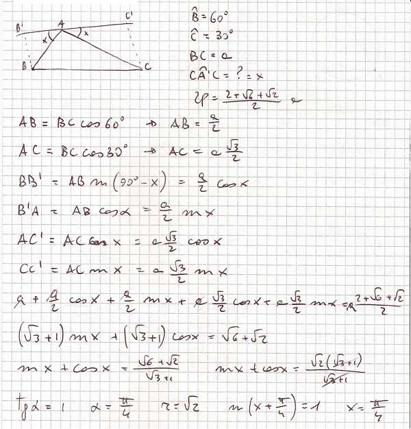Considera il triangolo rettangolo ABC che ha gli angoli acuti ABC = 60° e BCA = 30° e l’ipotenusa BC = a . Per il vertice A conduci una retta s esterna al triangolo e indica con B’ e C’ le proiezioni ortogonali di B e C su di essa. Determina l’angolo CAC’ sapendo che il perimetro del trapezio BCC’B’ è (2 + √6 + √2)/2 a .