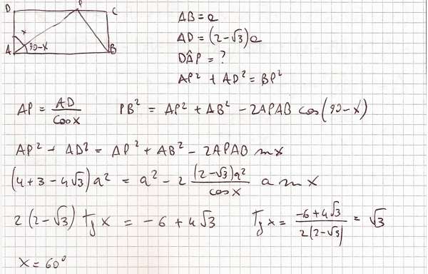 Nel rettangolo ABCD è inscritto il triangolo ABP, col vertice P sul lato CD. Le misure dei lati del rettangolo sono AB = a e AD = (2 – √3)a . Determina l’angolo DAP sapendo che è valida la relazione AP^2 + AD^2 = BP^2 .