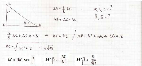 Trigonometria – Esercizio 3 In un triangolo rettangolo un cateto è i 3/8 dell’altro e la loro somma è 44 cm. Risolvi il triangolo.