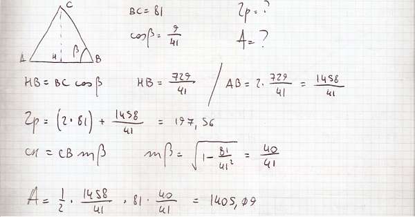 Trigonometria – Esercizio 5 Il lato obliquo di un triangolo isoscele è lungo 81 cm e il coseno dell’angolo alla base è 9/41. Trova il perimetro e l’area.