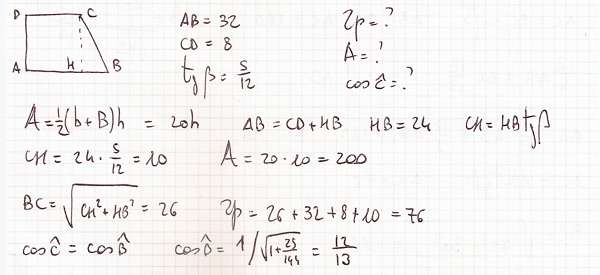 Trigonometria – Esercizio 9 Il trapezio ABCD è rettangolo in A e D. Sapendo che AB = 32 cm , CD = 8 cm e tg(ABC) = 5/12 , calcola il perimetro e l’area del trapezio e cos(BCD).