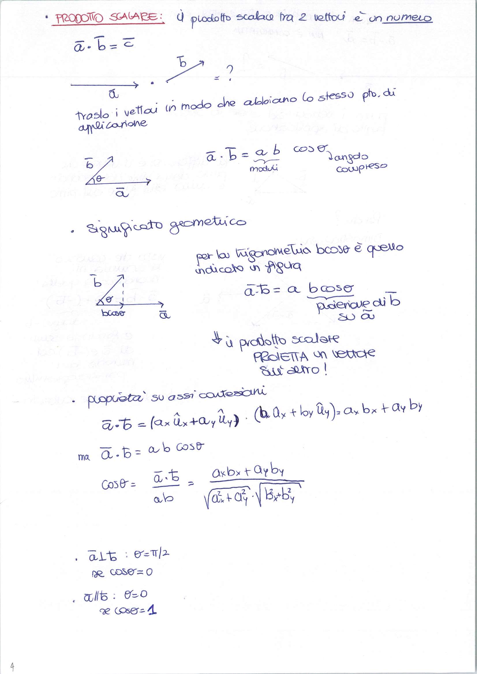 1. Ciao, in queste pagine si trovano svariate nozioni utili ma temo ci sia una piccola svista nella parte dedicata al prodotto scalare: se i 2 vettori sono paralleli il coseno dell’angolo compreso è 1. :)