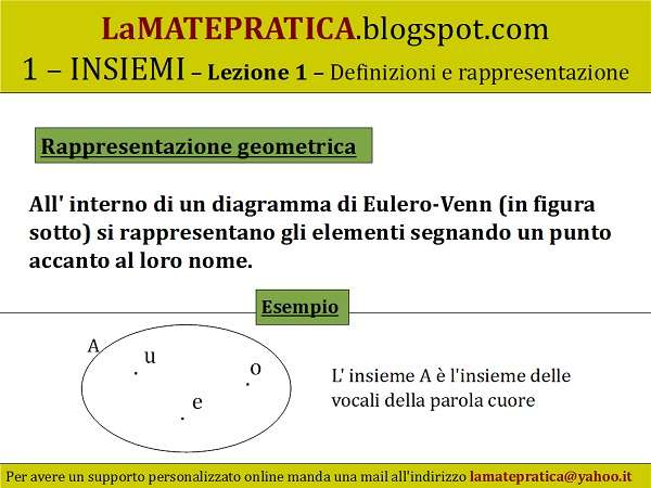 Rappresentazione geometrica. All’interno di un diagramma di Eulero-Venn (in figura sotto) si rappresentano gli elementi segnando un punto accanto al loro nome.