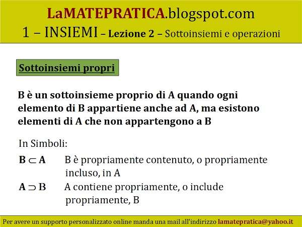 Sottoinsiemi propri. B è un sottoinsieme proprio di A quando ogni elemento di B appartiene anche ad A, ma esistono elementi di A che non appartengono a B. In Simboli: B A : B è propriamente contenuto, o propriamente incluso, in A. A B : A contiene propriamente, o include propriamente, B.