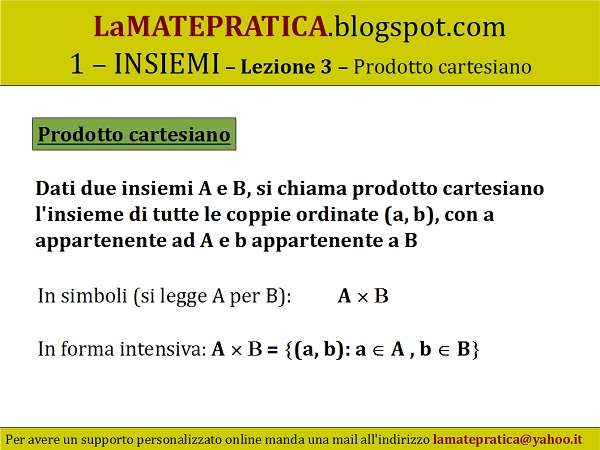 Prodotto Cartesiano – Dati due insiemi A e B, si chiama prodotto cartesiano l’insieme di tutte le coppie ordinate (a, b), con a appartenente ad A e b appartenente a B.