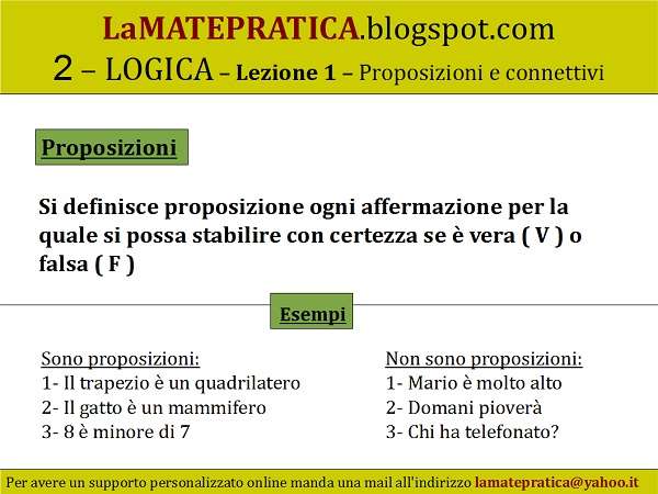 Proposizioni – Si definisce proposizione ogni affermazione per la quale si possa stabilire con certezza se è vera ( V ) o falsa ( F )
