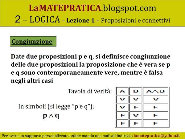 Congiunzione – Date due proposizioni p e q, si definisce congiunzione delle due proposizioni la proposizione che è vera se p e q sono contemporaneamente vere, mentre è falsa negli altri casi Rispondi
