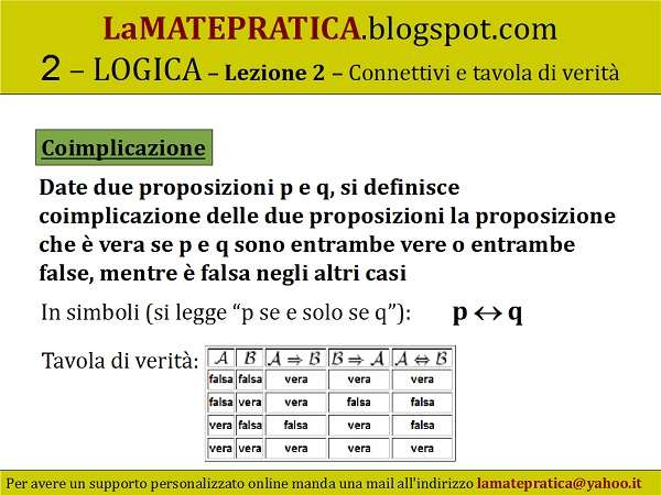 Coimplicazione – Date due proposizioni p e q, si definisce coimplicazione delle due proposizioni la proposizione che è vera se p e q sono entrambe vere o entrambe false, mentre è falsa negli altri casi