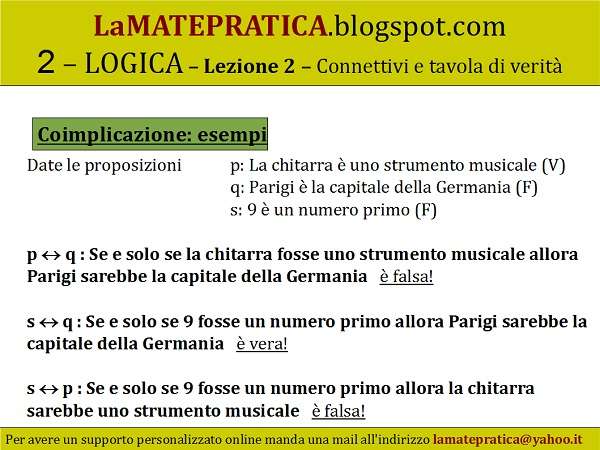 Coimplicazione: esempi Date le proposizioni p: La chitarra è uno strumento musicale (V) q: Parigi è la capitale della Germania (F) s: 9 è un numero primo (F)