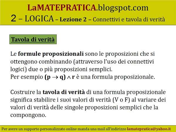 Tavola di verità – Le formule proposizionali sono le proposizioni che si ottengono combinando (attraverso l’uso dei connettivi logici) due o più proposizioni semplici. Per esempio (p q) r è una formula proposizionale.