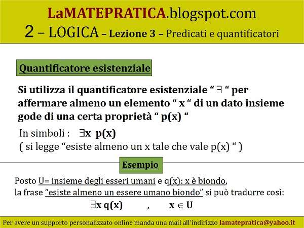 Quantificatore esistenziale – Si utilizza il quantificatore esistenziale “ “ per affermare almeno un elemento “ x “ di un dato insieme gode di una certa proprietà “ p(x) “