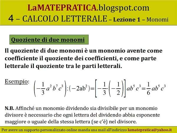 Il quoziente di due monomi è un monomio avente come coefficiente il quoziente dei coefficienti, e come parte letterale il quoziente tra le parti letterali.