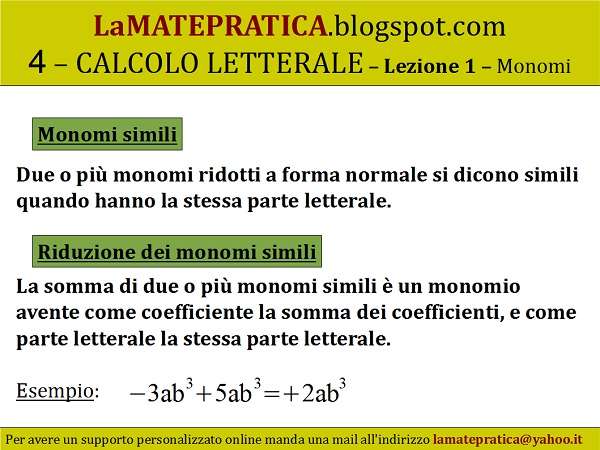 La somma di due o più monomi simili è un monomio avente come coefficiente la somma dei coefficienti, e come parte letterale la stessa parte letterale.