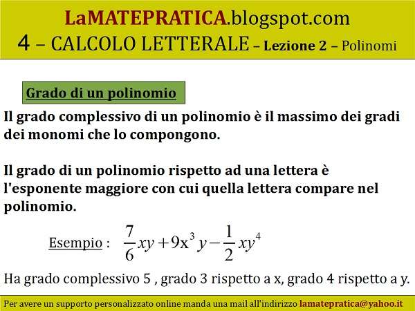 Il grado di un polinomio rispetto ad una lettera è l’esponente maggiore con cui quella lettera compare nel polinomio.