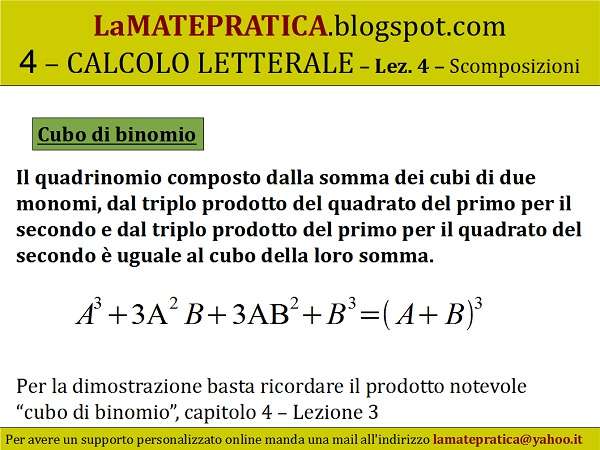 Il quadrinomio composto dalla somma dei cubi di due monomi, dal triplo prodotto del quadrato del primo per il secondo e dal triplo prodotto del primo per il quadrato del secondo è uguale al cubo della loro somma.