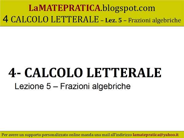 Calcolo letterale – Lezione 5 – Slide 1 <<– PRECEDENTE — SUCCESSIVA –>> Torna a: Capitolo 4 – CALCOLO LETTERALE Torna a: CORSO DI MATEMATICA