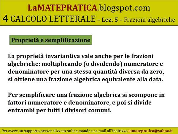 La proprietà invariantiva vale anche per le frazioni algebriche: moltiplicando (o dividendo) numeratore e denominatore per una stessa quantità diversa da zero, si ottiene una frazione algebrica equivalente alla data.