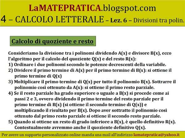 5) Quando si ottiene un resto di grado inferiore a B(x), è quello definitivo R(x). Contestualmente avremmo anche il quoziente definitivo Q(x).