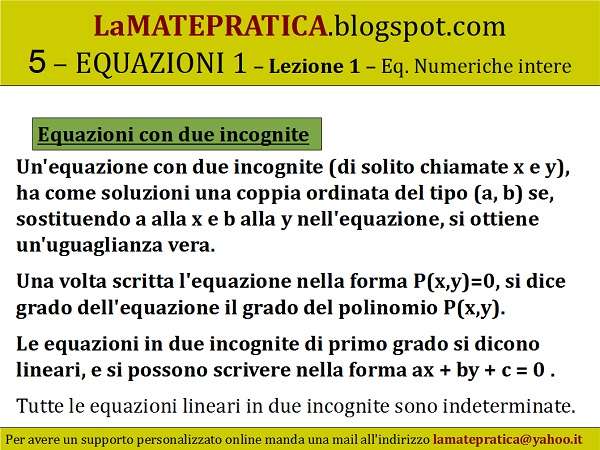Le equazioni in due incognite di primo grado si dicono lineari, e si possono scrivere nella forma ax + by + c = 0 .