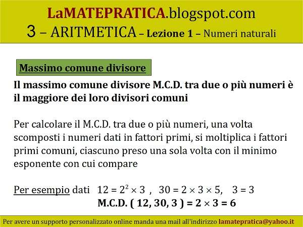Per esempio dati 12 = 22 3, 30 = 2 3 5, 3 = 3 M.C.D. ( 12, 30, 3 ) = 2 3 = 6