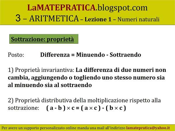 1) Proprietà invariantiva: La differenza di due numeri non cambia, aggiungendo o togliendo uno stesso numero sia al minuendo sia al sottraendo