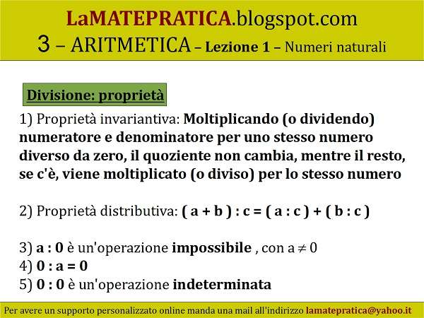 1) Proprietà invariantiva: Moltiplicando (o dividendo) numeratore e denominatore per uno stesso numero diverso da zero, il quoziente non cambia, mentre il resto, se c’è, viene moltiplicato (o diviso) per lo stesso numero