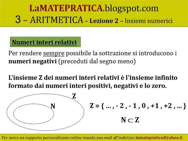 L’insieme Z dei numeri interi relativi è l’insieme infinito formato dai numeri interi positivi, negativi e lo zero.