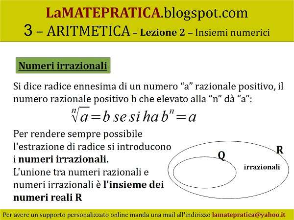 Per rendere sempre possibile l’estrazione di radice si introducono i numeri irrazionali. L’unione tra numeri razionali e numeri irrazionali è l’insieme dei numeri reali R