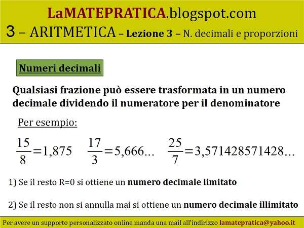 Numeri decimali Qualsiasi frazione può essere trasformata in un numero decimale dividendo il numeratore per il denominatore. 1) Se il resto R=0 si ottiene un numero decimale limitato 2) Se il resto non si annulla mai si ottiene un numero decimale illimitato