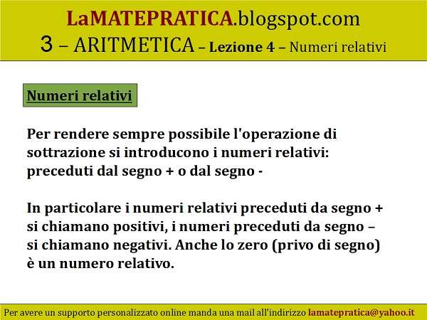 Per rendere sempre possibile l’operazione di sottrazione si introducono i numeri relativi: preceduti dal segno + o dal segno –