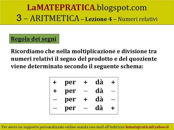 Ricordiamo che nella moltiplicazione e divisione tra numeri relativi il segno del prodotto e del quoziente viene determinato secondo il seguente schema: