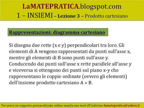 Rappresentazioni: diagramma cartesiano – Si disegna due rette (x e y) perpendicolari tra loro. Gli elementi di A vengono rappresentati da punti sull’asse x, mentre gli elementi di B sono punti sull’asse y. Conducendo dai punti sull’asse x rette parallele all’asse y e viceversa si ottengono dei punti sul piano x-y che rappresentano le coppie ordinate (ovvero gli elementi) dell’insieme prodotto cartesiano A B.